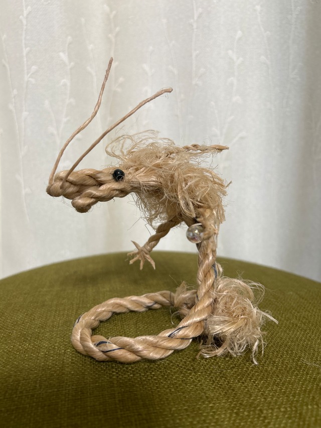 精麻の護り龍 精麻とは 日本古来よりある、大麻の茎を、発酵させて、皮の薄い膜をそいで、中の皮を薄く伸ばして、 丁寧に丁寧に手間と時間をかけて作り出される精練された茎の皮です。 繊細さや丈夫さが特徴で、神社のしめ縄・鈴緒などの御神事に使われてきた神聖なものとして受け継がれてきています。 細く割いて糸をより、糸を作って、それを織ることで布となり、麻の服となったり 日本の生活には欠かせないものでした。 そのような精麻で心を込めて作られた龍です。 龍は、古来より日本では伝説や神話に登場し、氣を巡らせる力強さや幸運を象徴する存在です。 私の制作する龍は、天然素材のため、全てが一点ものです。 愛嬌のある可愛らしさに親しみを感じる龍で、 特別な作品です。 茜染の染麻を入れてますが、少しくすんだ色に染め上がっています。 目は、ストロベリークォーツ 宝珠は、水晶です 龍のサポートがあなたの周りに護りを巡らせ、良き未来へと導いてくれるでしょう。 ※商品の色味やデザインは、写真と実物とで異なる場合がございますので、予めご了承ください。 ワイヤーを使用しております。取り扱いにご注意ください。 発送させていただいたときは、少し箱に合わせておりますので、届きましたら中から出して ご自分で心地よく龍の姿を整えてください。 どうぞあなたのお役に立ちますように。