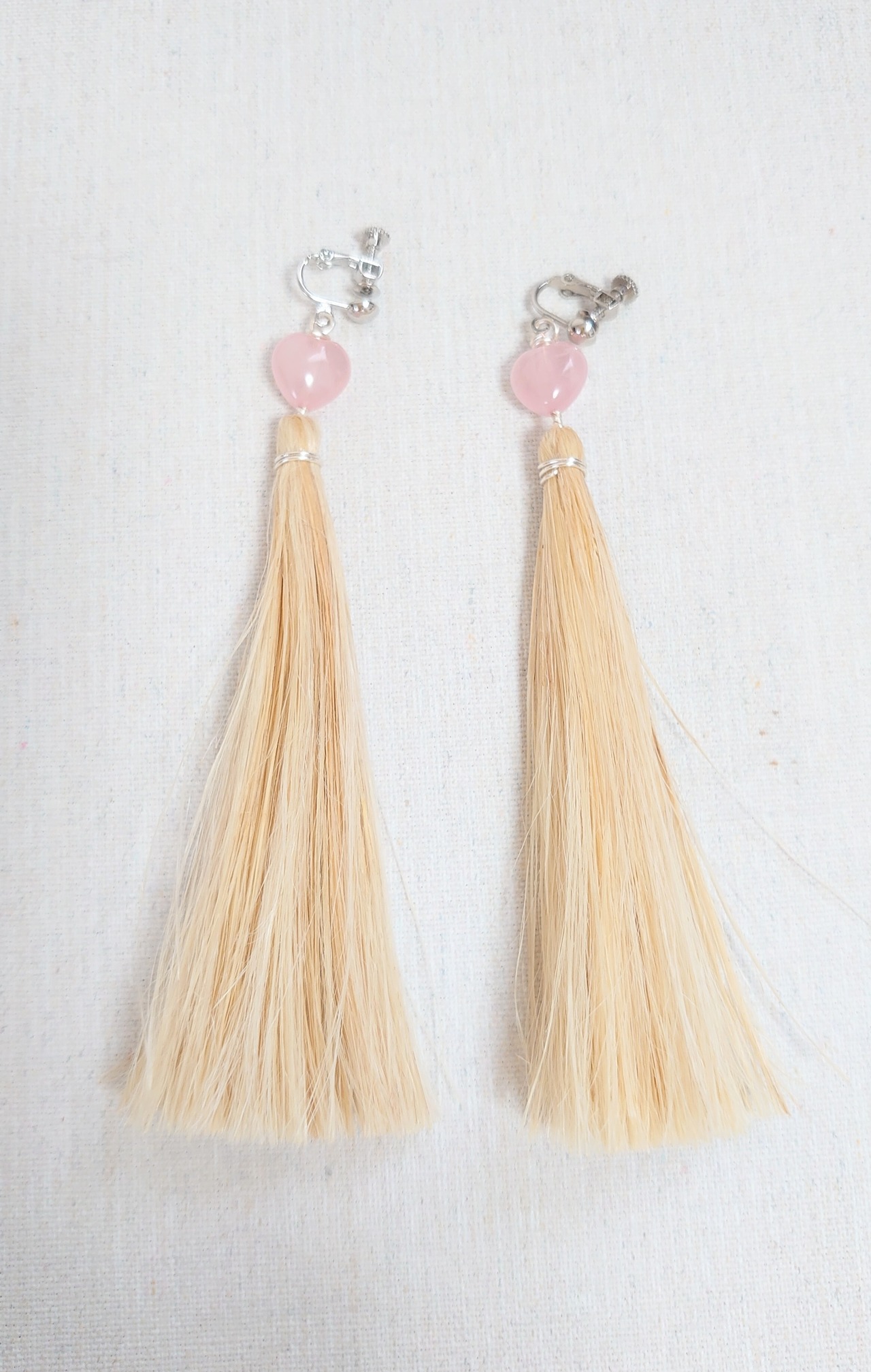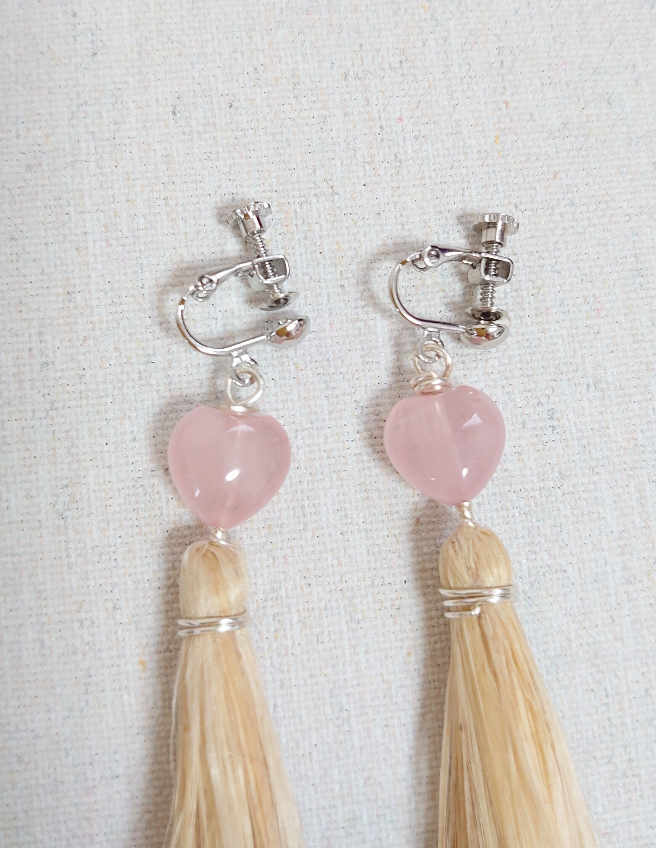 無漂白の国産野州麻の特上精麻で作った、♥のローズクォーツのイヤリングです。